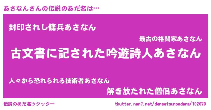 | ヘコむあだ名 | 『あさなん(小並感)』『あさもー』 |