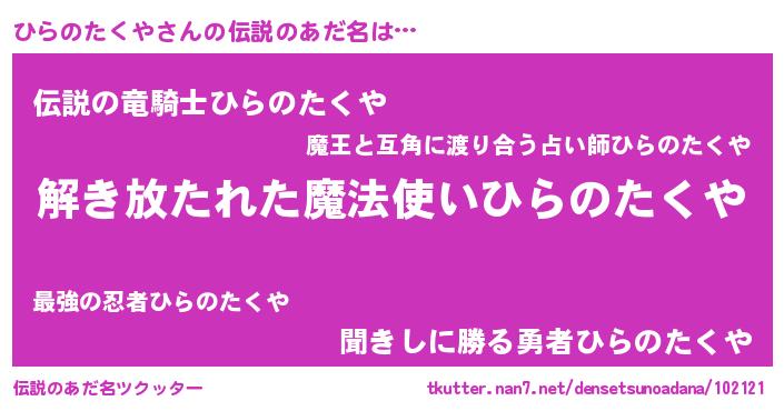 | 男性向けラノベタイトル風あだ名 | 『ひらのたくやの嫁は女の子じゃないと思った?』 |
