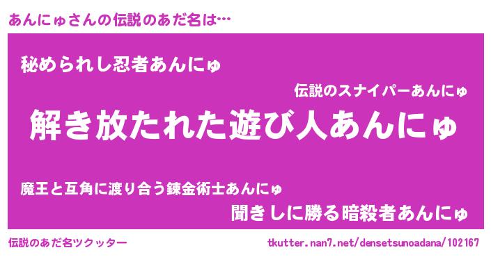 | 男性向けラノベタイトル風あだ名 | 『あんにゅの嫁は女の子じゃないと思った?』 |