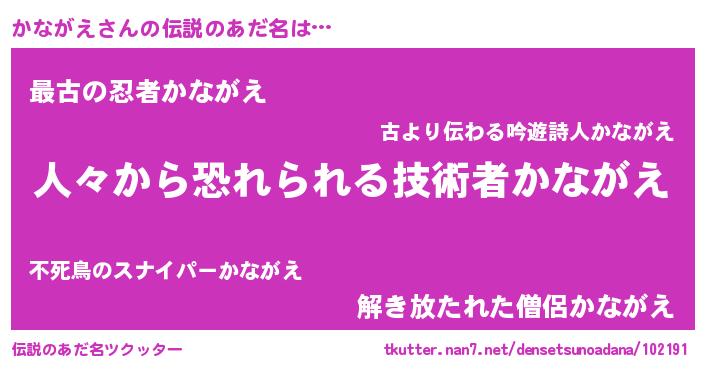 | 肩書あだ名 | 『かながえ教授』『かながえ大佐』 |