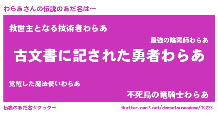 | 男性向けラノベタイトル風あだ名 | 『誰もが恐れるあのわらあが、ぼくの専属メイドになるようです。』 |