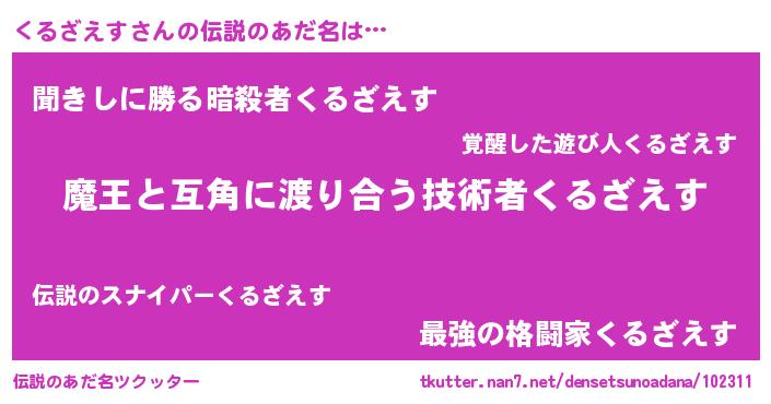 | ヒーロー風カッコイイあだ名 | 『慈愛の使者くるざえす』『仮面クルダー』 |