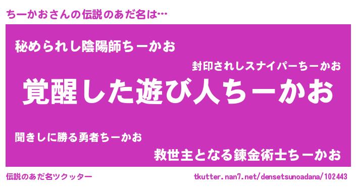 | 男性向けラノベタイトル風あだ名 | 『ちーかおの嫁は女の子じゃないと思った?』 |