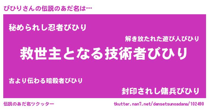 | 女子向けラノベタイトル風あだ名 | 『死神びひりの再婚』『びひり伯爵の花嫁』 |