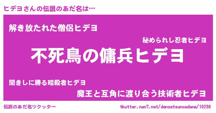 | 男性向けラノベタイトル風あだ名 | 『魔弾の王とヒデヨ』『ヒデヨの憂鬱』 |