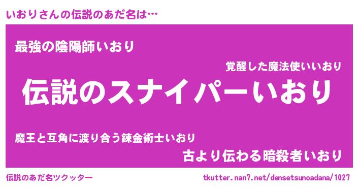 | 男性向けラノベタイトル風あだ名 | 『いおりの憂鬱』『魔弾の王といおり』 |