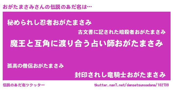 | 男性向けラノベタイトル風あだ名 | 『この素晴らしい世界におがたまさみを!』 |
