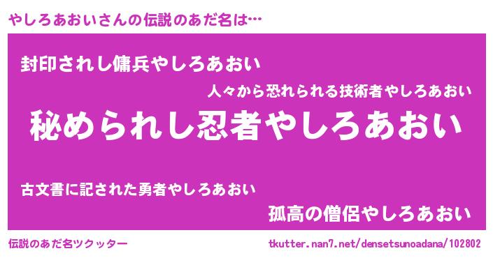 | 男性向けラノベタイトル風あだ名 | 『ヤシロアオイスレイヤー』 |