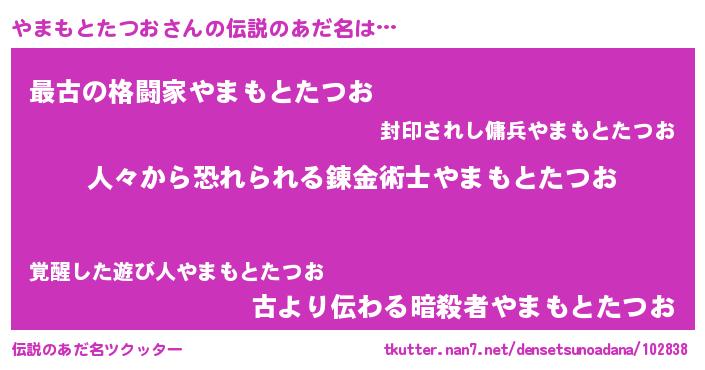 | 男性向けラノベタイトル風あだ名 | 『おまえをオタクにしてやるから、俺をやまもとたつおにしてくれ! 』 |