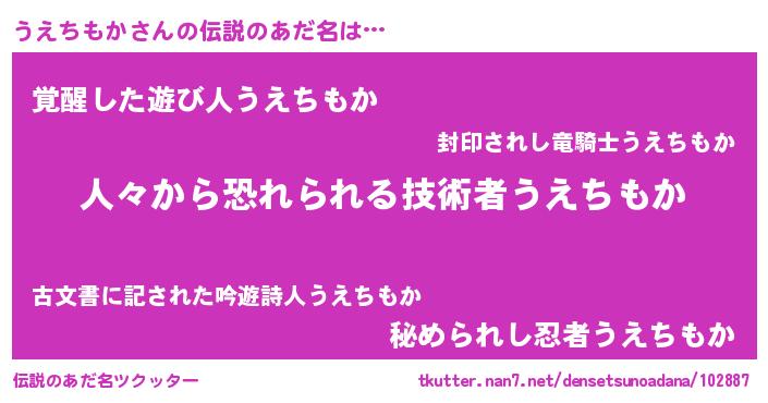 | 男性向けラノベタイトル風あだ名 | 『おまえをオタクにしてやるから、俺をうえちもかにしてくれ! 』 |