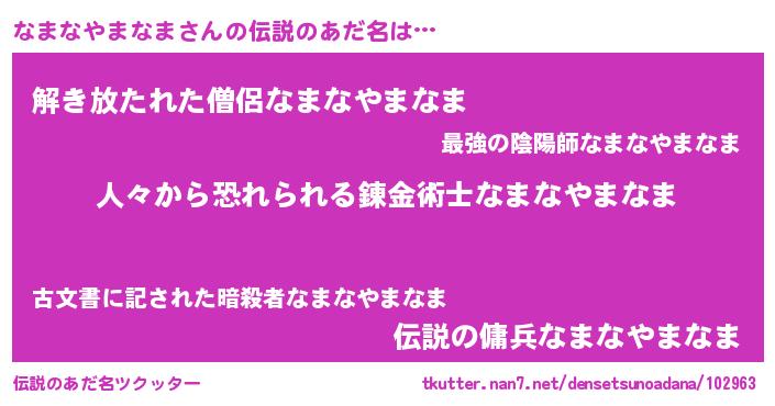 | 意味不明あだ名 | 『住所不定無職なまなやまなま(98歳)』 |