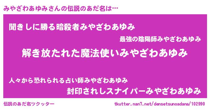 | ヘコむあだ名 | 『みやを』『みやざわあゆみ(爆)』 |