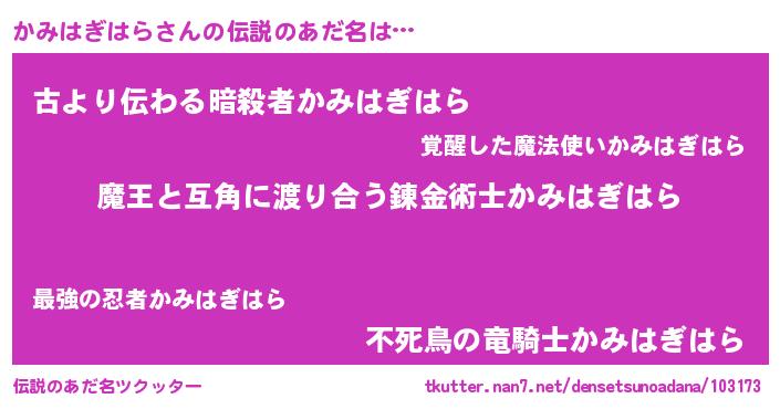 | 男性向けラノベタイトル風あだ名 | 『ノーゲーム・ノーカミハギハラ』 |