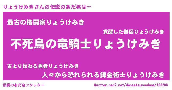 | 女子向けラノベタイトル風あだ名 | 『りょうけみき姫と円卓の騎士』 |