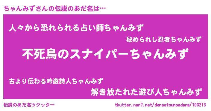 | 意味不明あだ名 | 『住所不定無職ちゃんみず(79歳)』 |