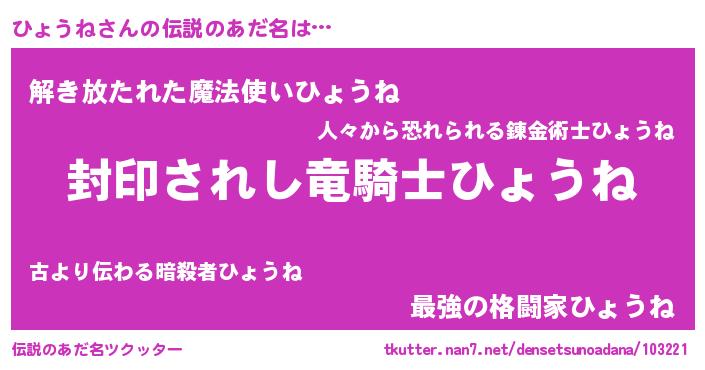 | 男性向けラノベタイトル風あだ名 | 『ひょうね~年齢イコール彼女いない歴の魔法使い~』 |