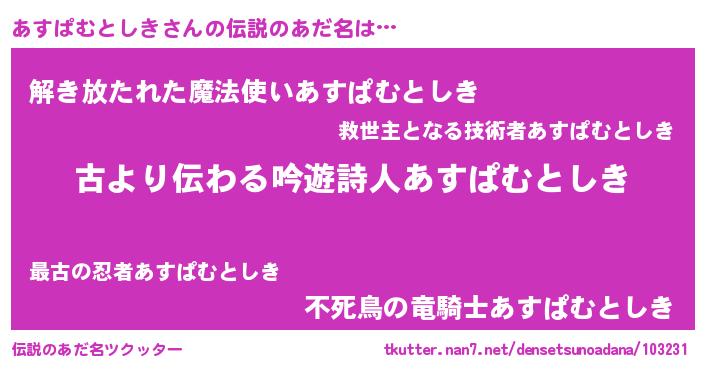 | 意味不明あだ名 | 『自称あすぱむとしき』 |