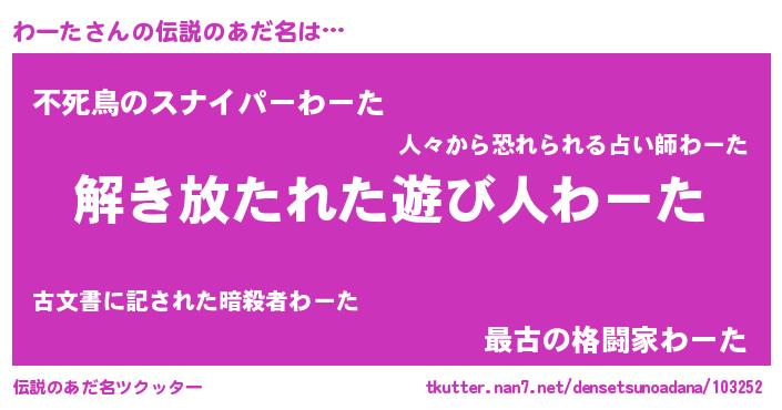 | 意味不明あだ名 | 『とにかく怪しいわーた』『自称わーた』 |