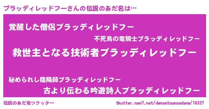 | 男性向けラノベタイトル風あだ名 | 『ブラッディレッドフー~年齢イコール彼女いない歴の魔法使い~』 |