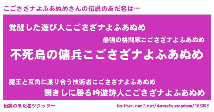 | 男性向けラノベタイトル風あだ名 | 『こごさざナよふあぬめの憂鬱』 |