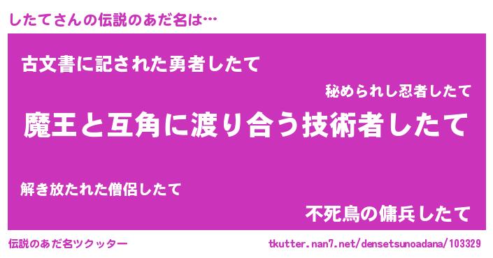 | 男性向けラノベタイトル風あだ名 | 『おまえをオタクにしてやるから、俺をしたてにしてくれ! 』 |