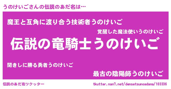| ヒーロー風カッコイイあだ名 | 『超時空戦士ウノケイゴ』『天弓騎士ウノ』 |