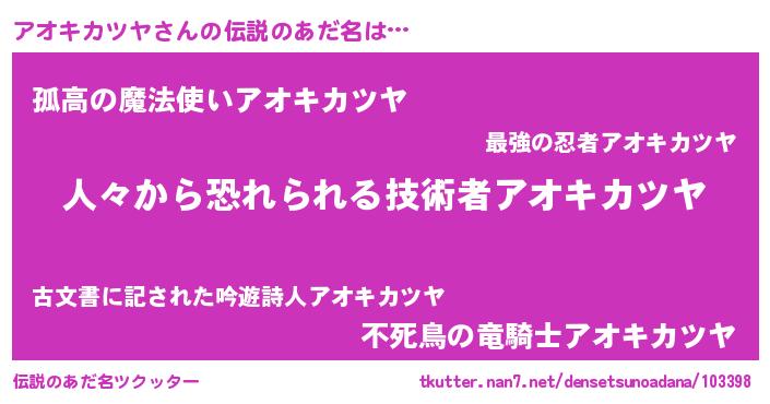 | 女子向けラノベタイトル風あだ名 | 『アオキカツヤが死なない童話 林檎のアオキカツヤの診療簿』 |