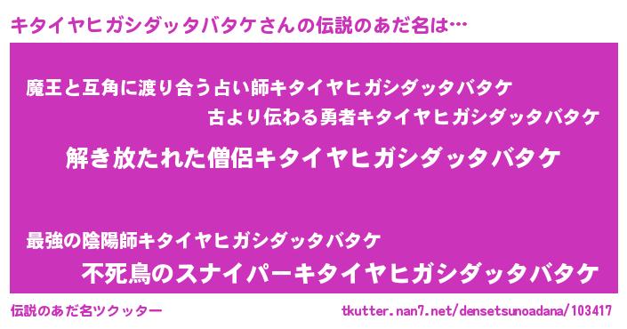 | 欧米人風あだ名 | 『ウサインキタイヤヒガシダッタバタケ』 |