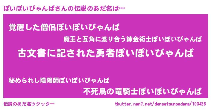| 男性向けラノベタイトル風あだ名 | 『この素晴らしい世界にぽいぽいびゃんばを!』 |