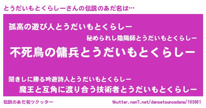 | 意味不明あだ名 | 『住所不定無職とうだいもとくらしー(53歳)』 |