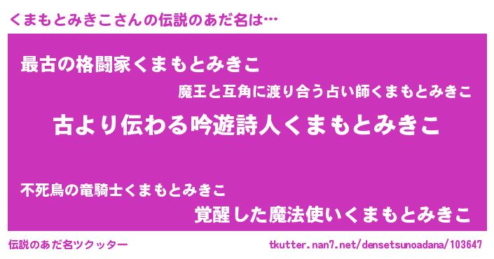| 女子向けラノベタイトル風あだ名 | 『くまもとみきこの契約王妃』 |