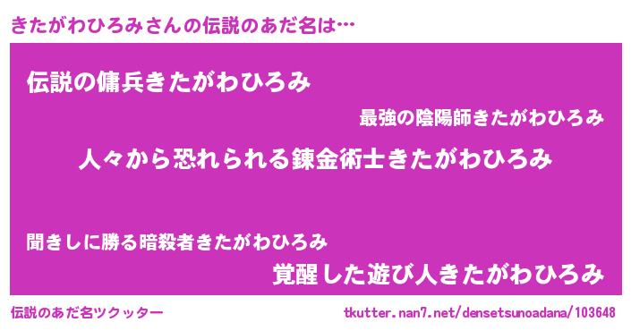| 男性向けラノベタイトル風あだ名 | 『おまえをオタクにしてやるから、俺をきたがわひろみにしてくれ! 』 |