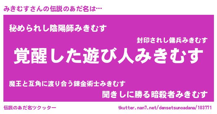 | 男性向けラノベタイトル風あだ名 | 『みきむすに滅ぼされるだけの簡単なお仕事です』 |