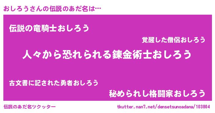 | 男性向けラノベタイトル風あだ名 | 『おまえをオタクにしてやるから、俺をおしろうにしてくれ! 』 |