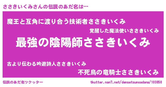 | 男性向けラノベタイトル風あだ名 | 『ささきいくみ~年齢イコール彼女いない歴の魔法使い~』 |