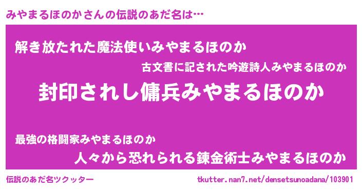 | 男性向けラノベタイトル風あだ名 | 『みやまるほのか~年齢イコール彼女いない歴の魔法使い~』 |