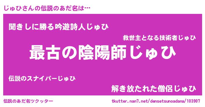 | 意味不明あだ名 | 『住所不定無職じゅひ(93歳)』『自称じゅひ』 |