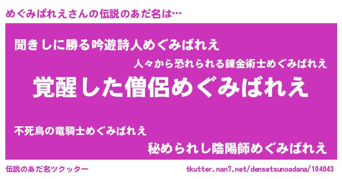 | 男性向けラノベタイトル風あだ名 | 『めぐみばれえの嫁は女の子じゃないと思った?』 |