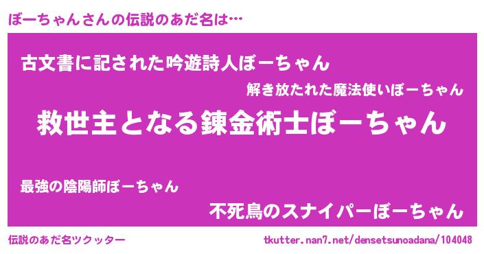 | 男性向けラノベタイトル風あだ名 | 『うちのぼーちゃんが世界を掌握している!』 |