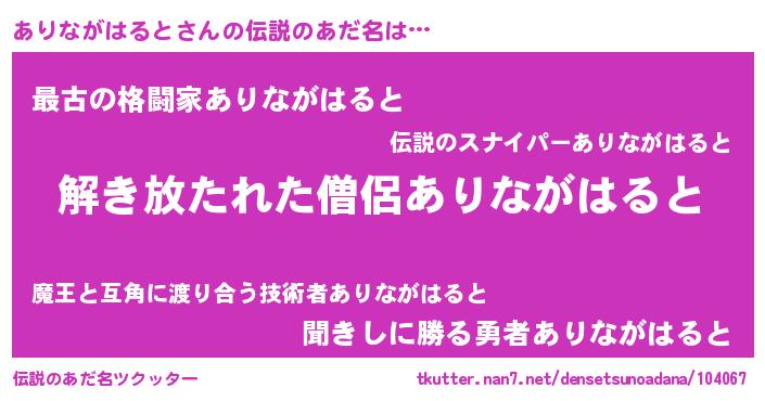 | 男性向けラノベタイトル風あだ名 | 『冴えないありながはるとの育てかた』 |