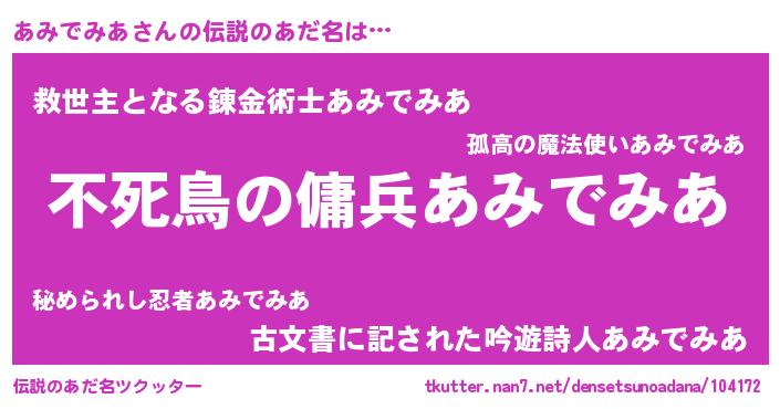 | 女子向けラノベタイトル風あだ名 | 『あみでみあ姫と円卓の騎士』 |