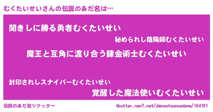 | 男性向けラノベタイトル風あだ名 | 『転生したらむくたいせいだった件』 |