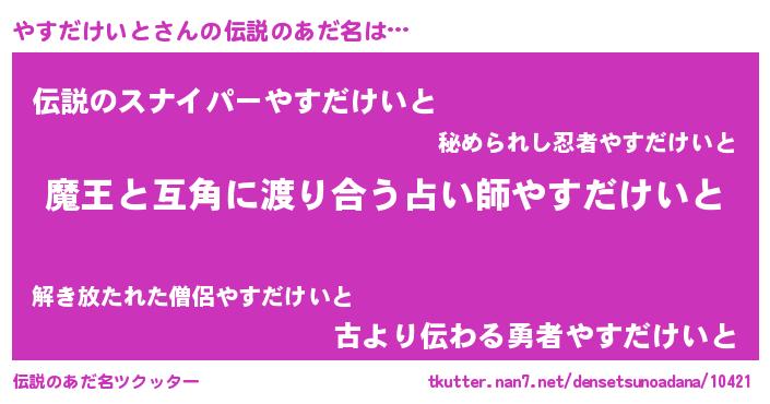 | 男性向けラノベタイトル風あだ名 | 『転生したらやすだけいとだった件』 |