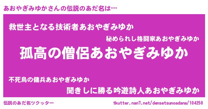 | 男性向けラノベタイトル風あだ名 | 『アオヤギミユカスレイヤー』 |