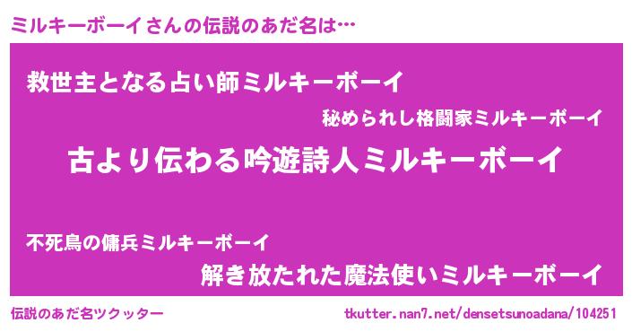 | 男性向けラノベタイトル風あだ名 | 『ミルキーボーイという概念が存在しない退屈な世界 』 |