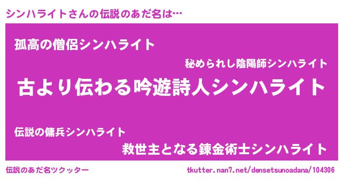 | 男性向けラノベタイトル風あだ名 | 『Re:シンハライトから始める異世界生活』 |
