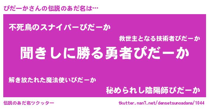 | 女子向けラノベタイトル風あだ名 | 『異世界で失敗しない100のぴだーか』 |