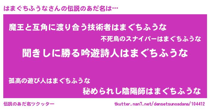 | 男性向けラノベタイトル風あだ名 | 『はまぐちふうなという概念が存在しない退屈な世界 』 |
