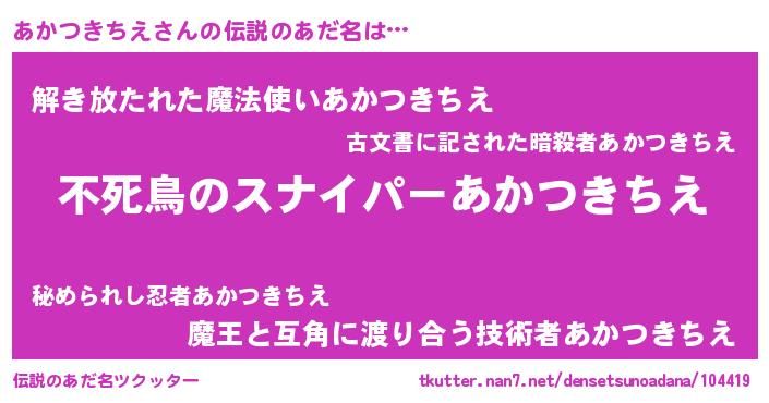 | ヒーロー風カッコイイあだ名 | 『スーパーアカツキチエ』『魔戒騎士アカ』 |
