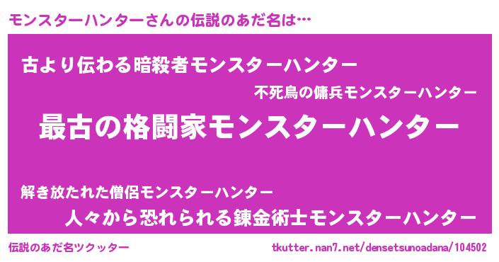 | 男性向けラノベタイトル風あだ名 | 『転生したらモンスターハンターだった件』 |